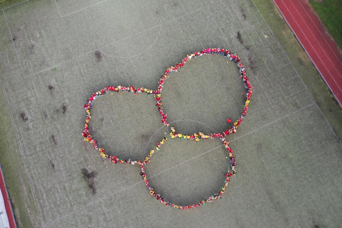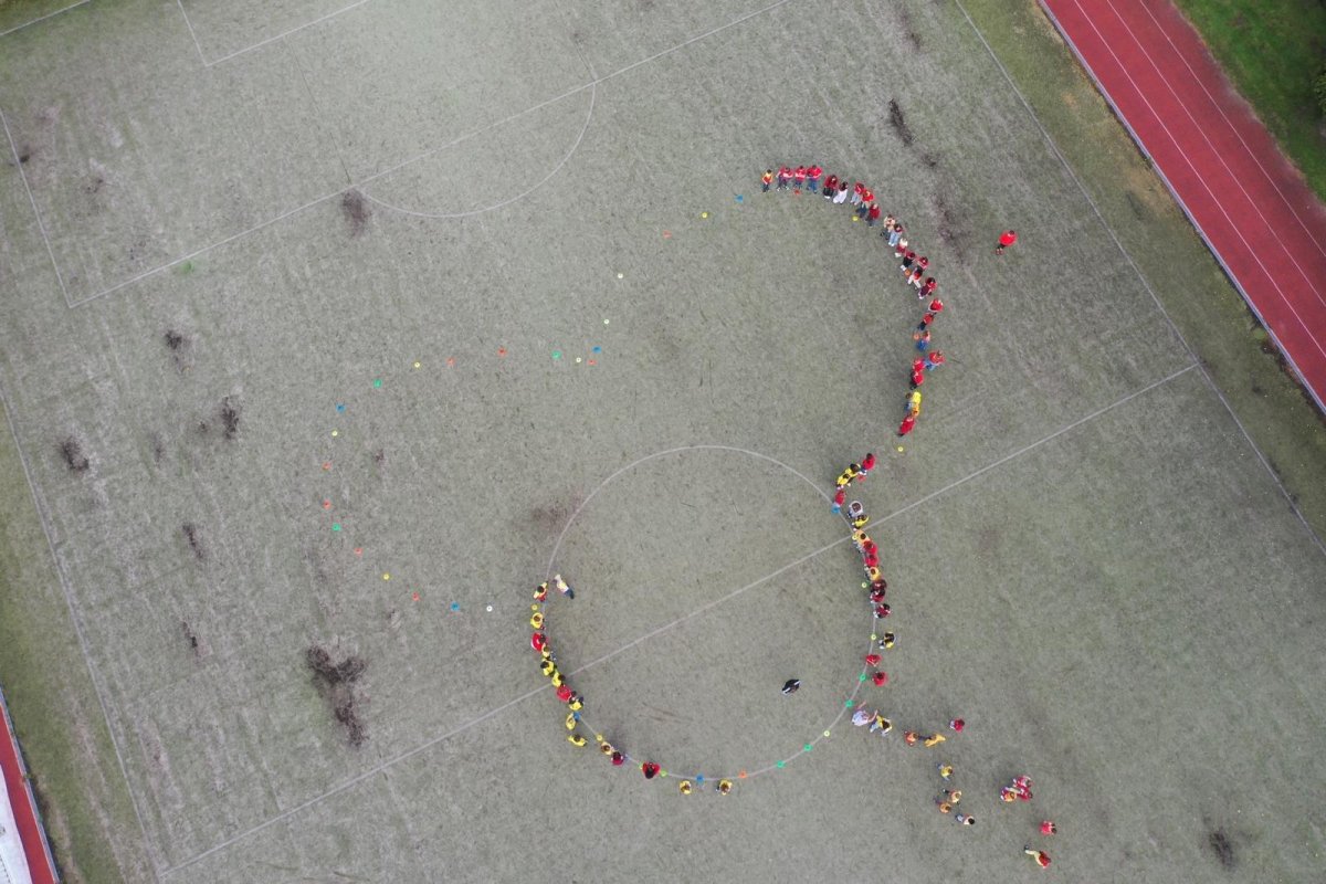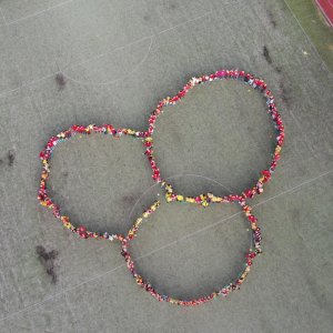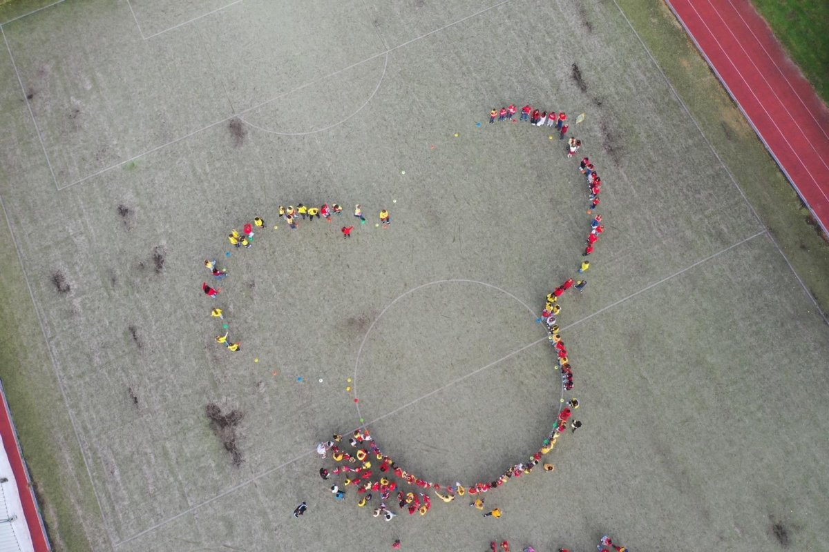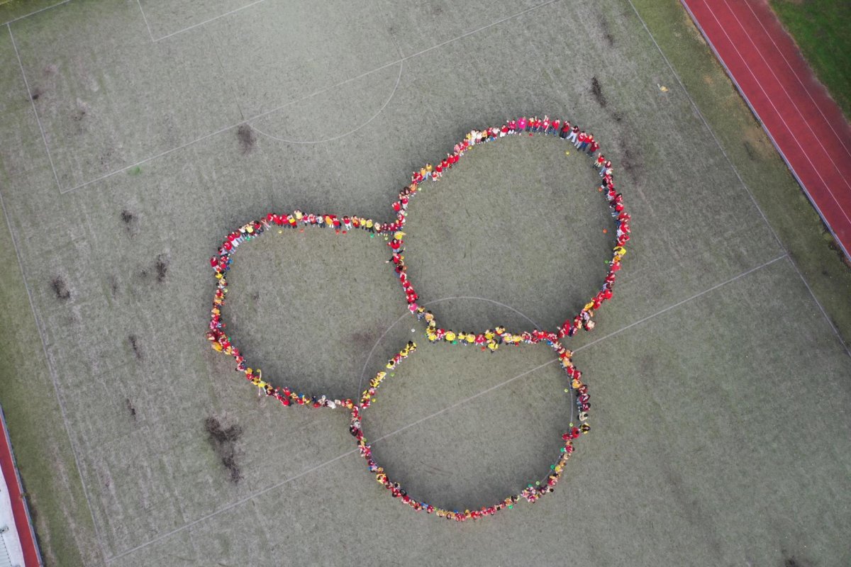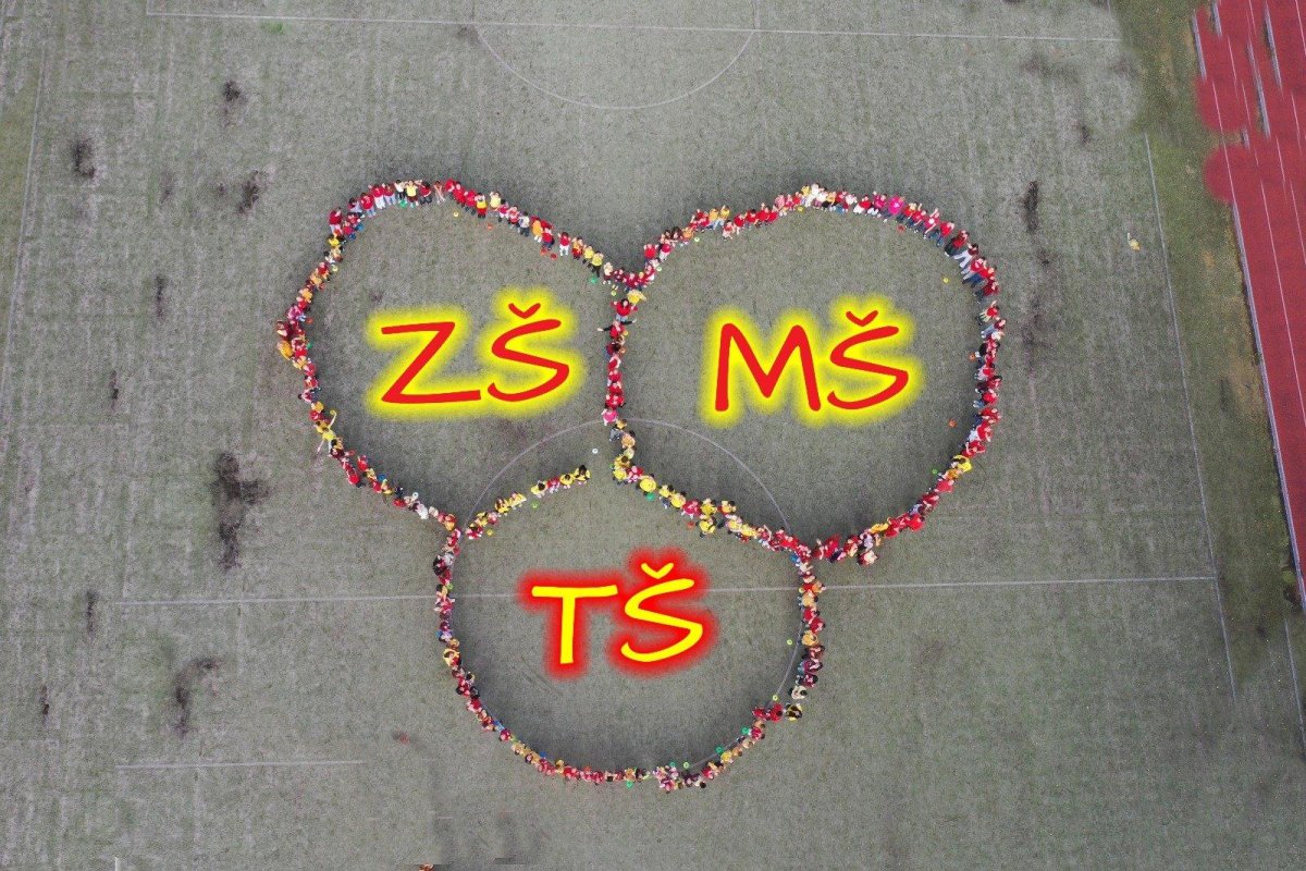 O velké přestávce jsme se společně sešli na školní zahradě a vytvořili 3 kruhy – logo naší školy. Celou akci jsme završili společnou fotkou z dronu, která zachytila naše žáky, kteří se hrdě oblékli do školních barev.