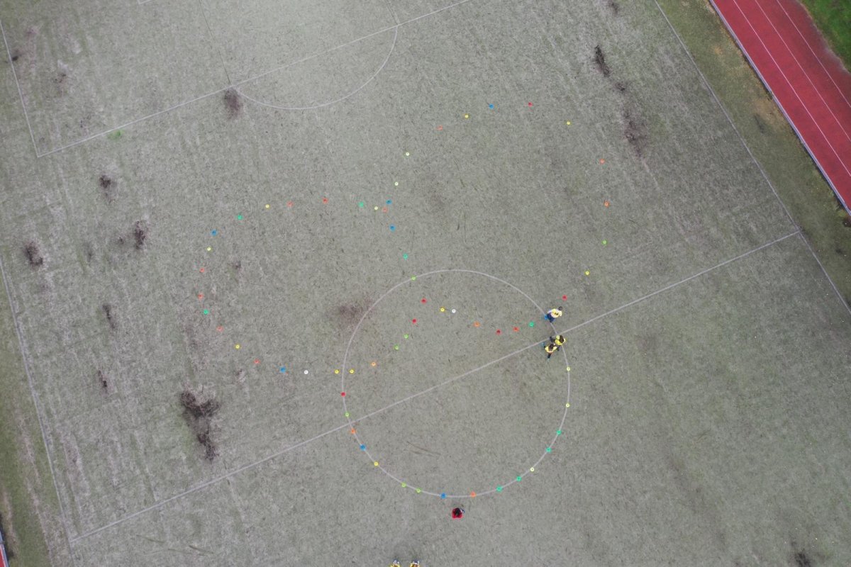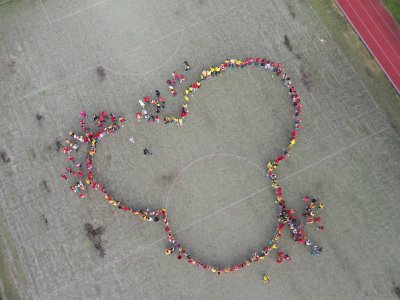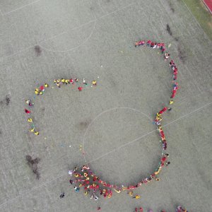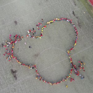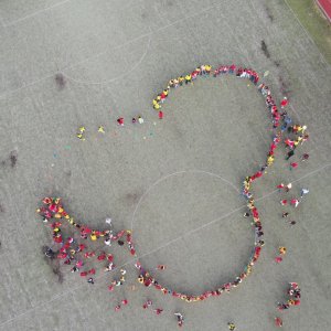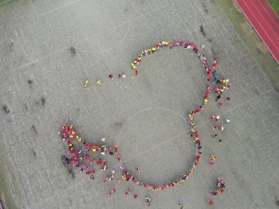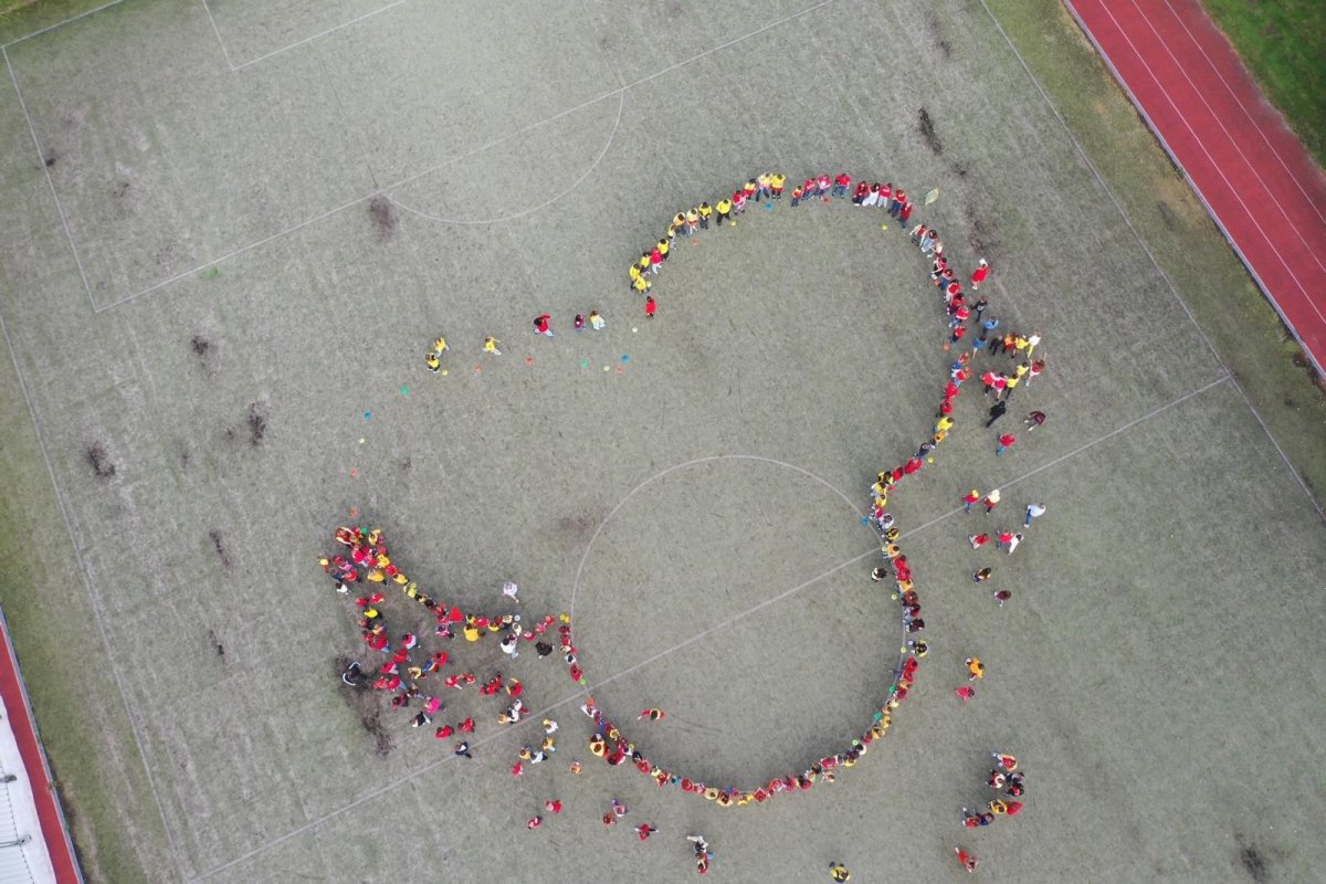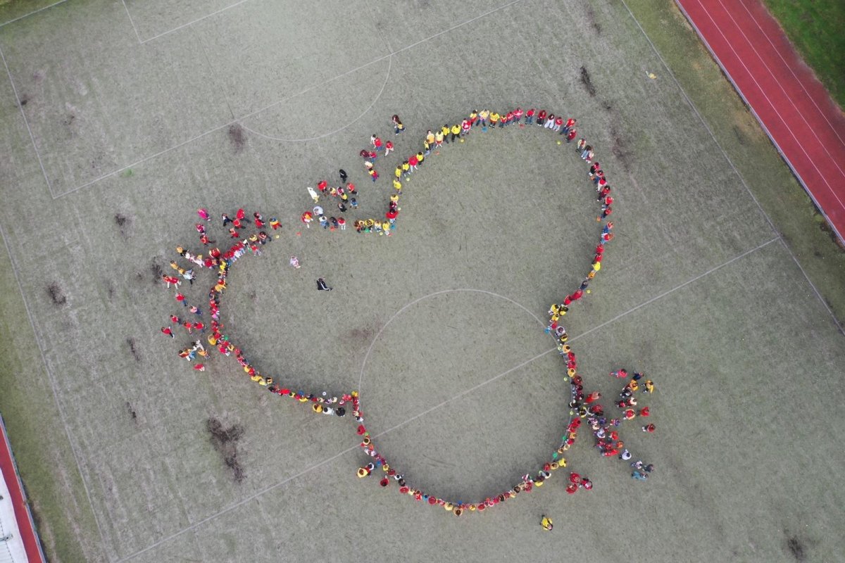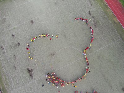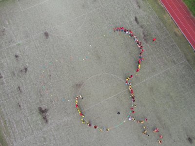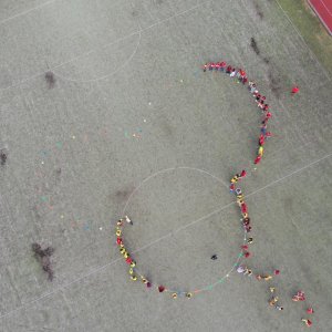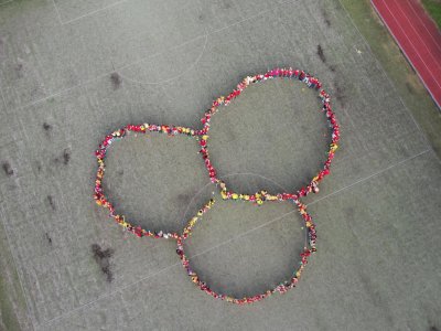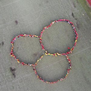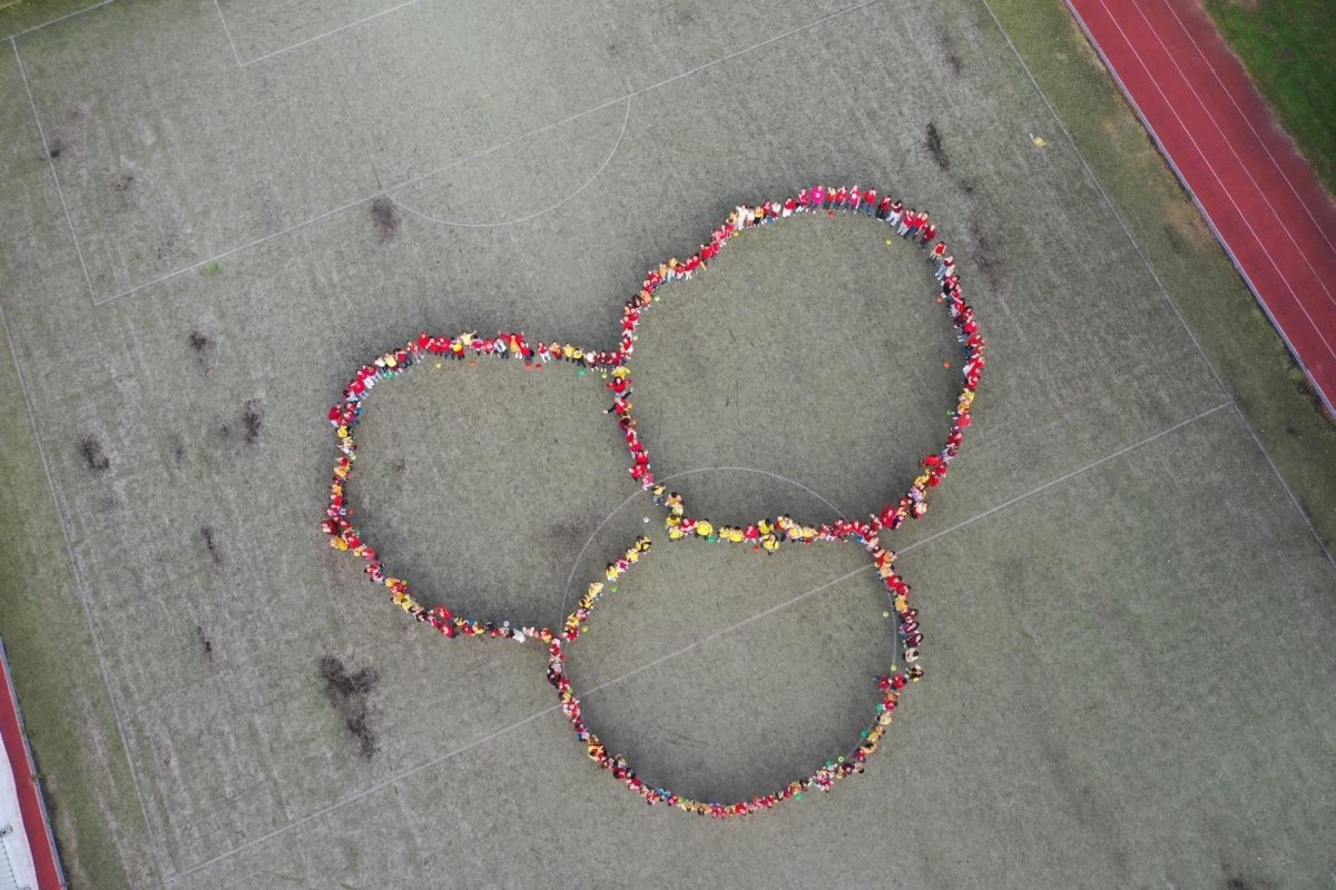 O velké přestávce jsme se společně sešli na školní zahradě a vytvořili 3 kruhy – logo naší školy. Celou akci jsme završili společnou fotkou z dronu, která zachytila naše žáky, kteří se hrdě oblékli do školních barev.