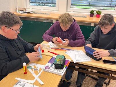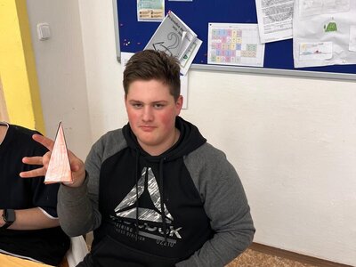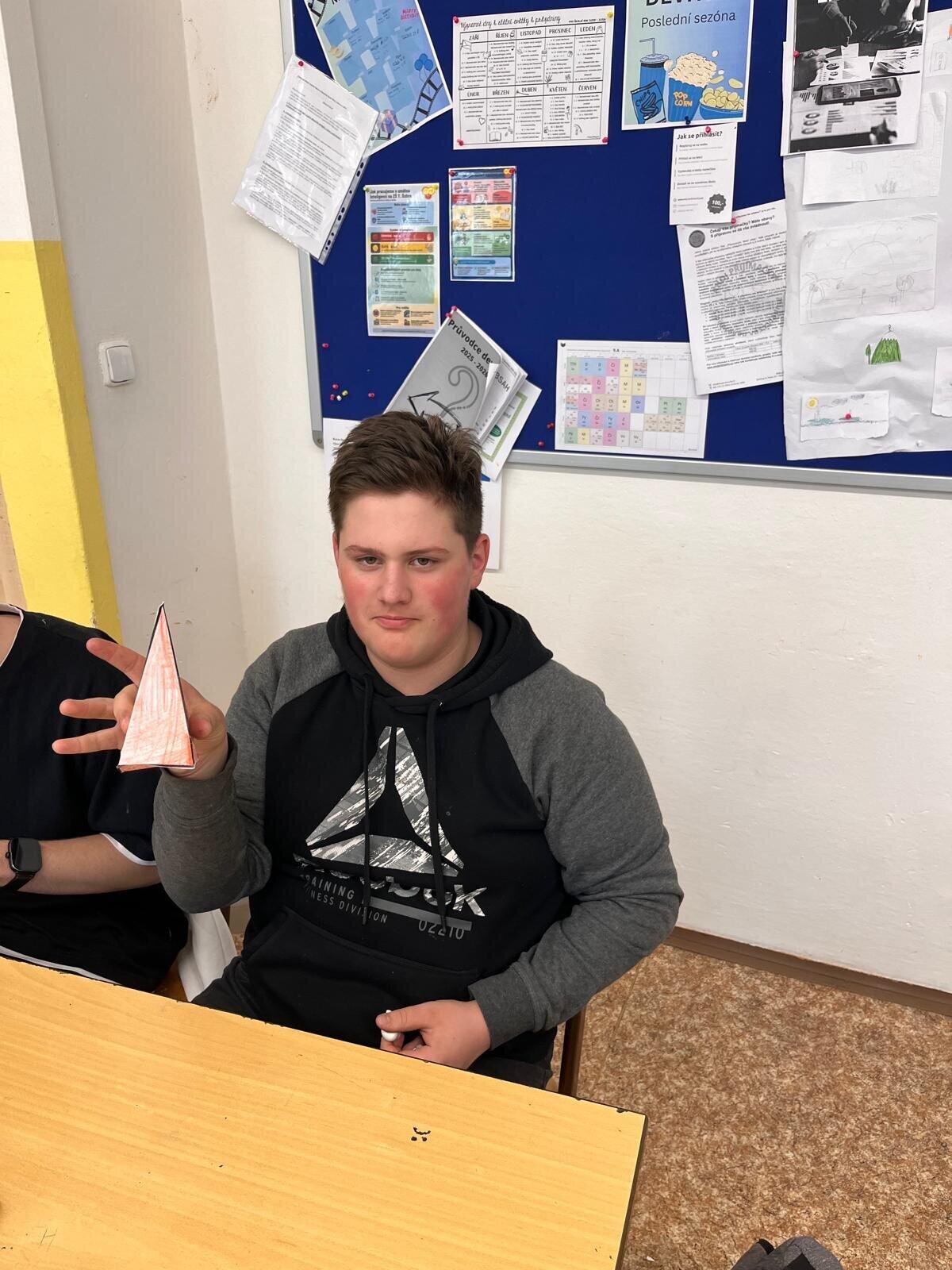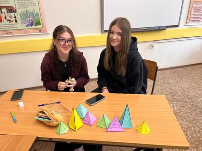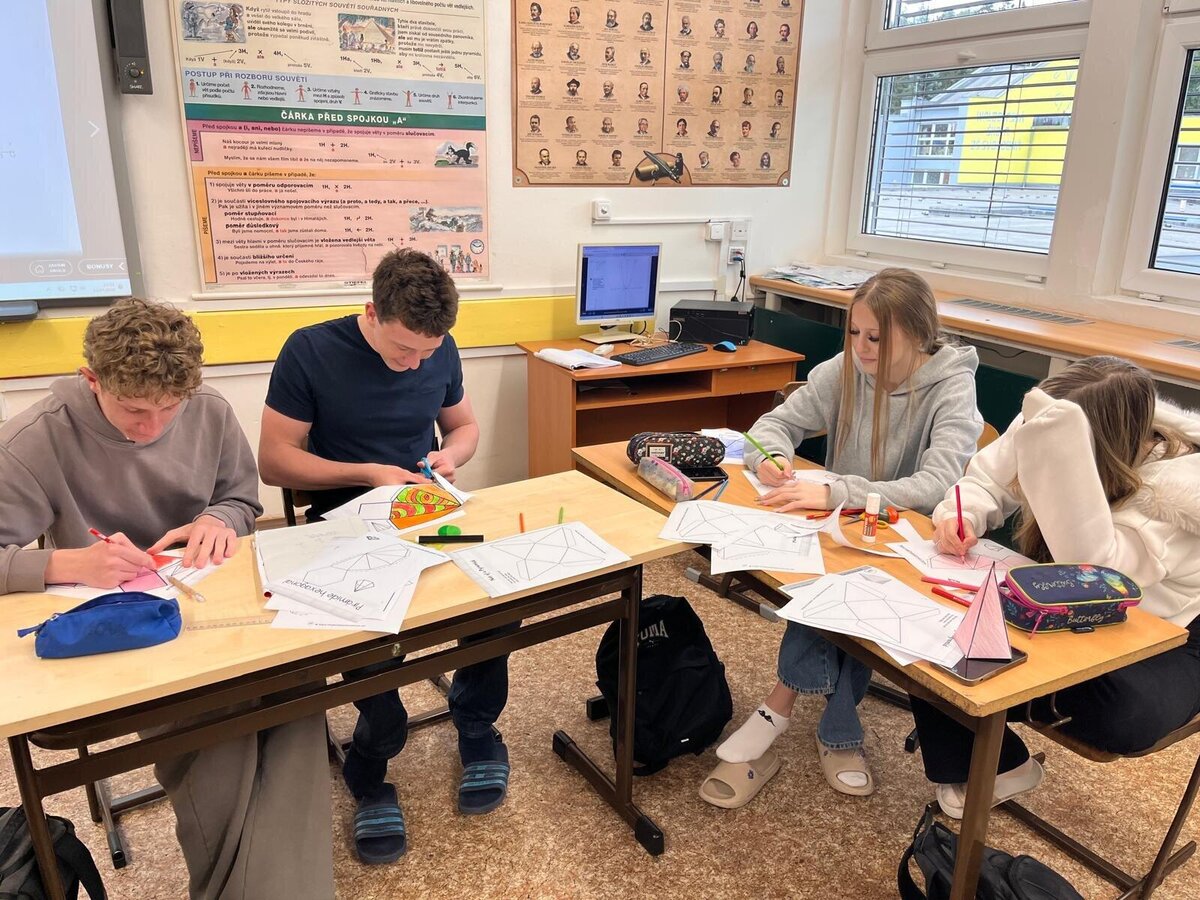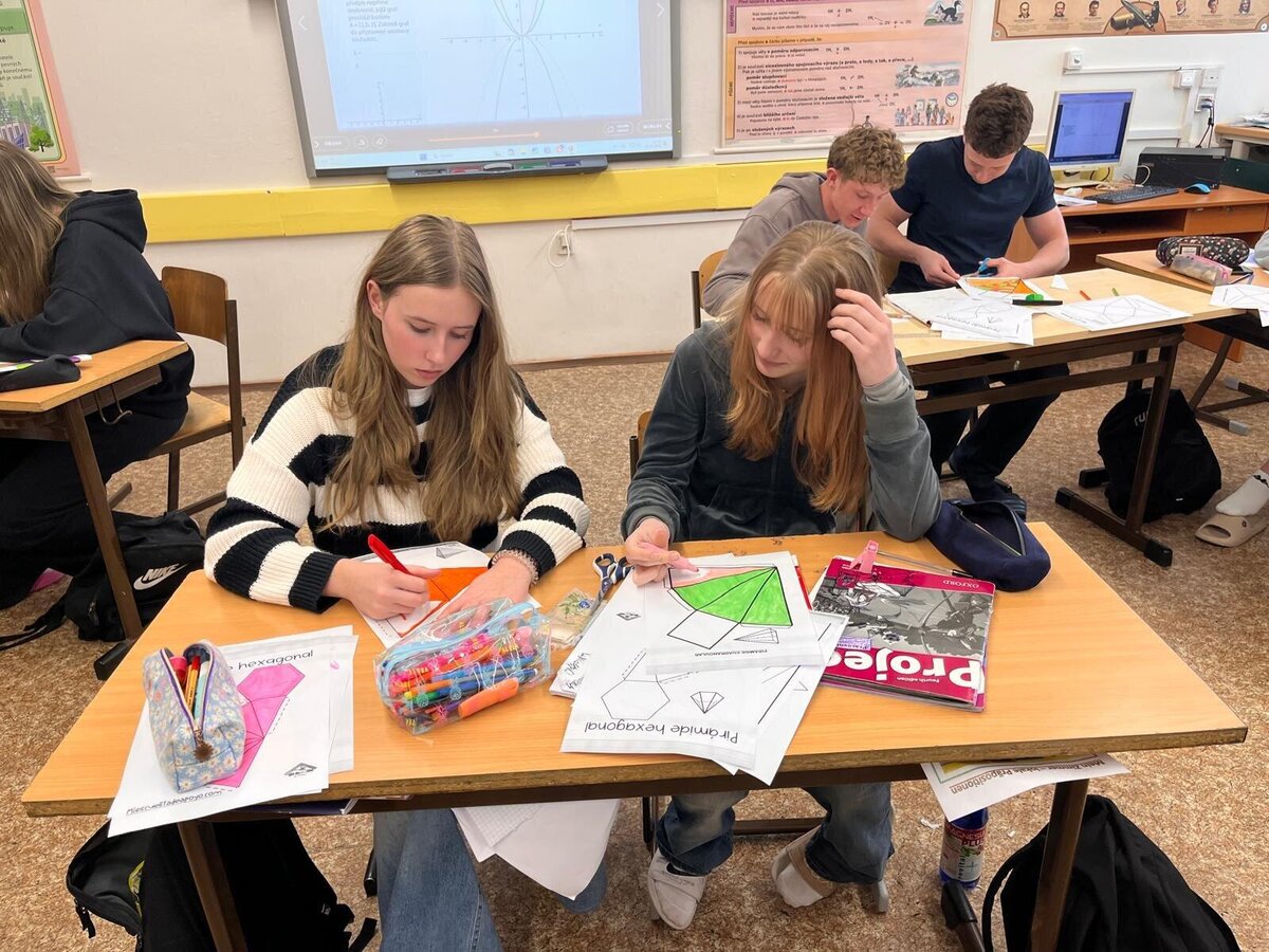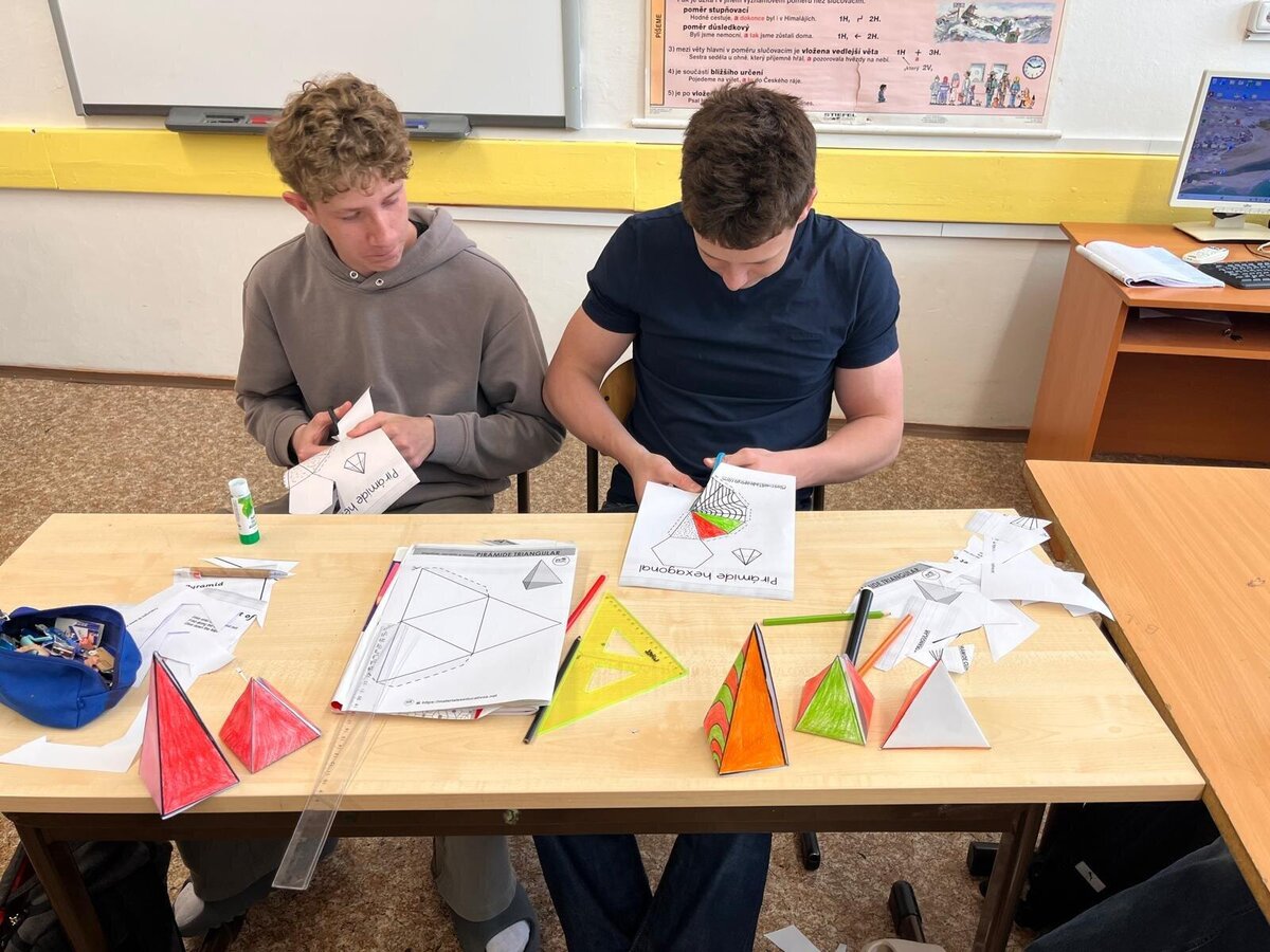 Žáci 9.A dnes v matematice skládali jehlany z papíru a trénovali prostorovou orientaci.