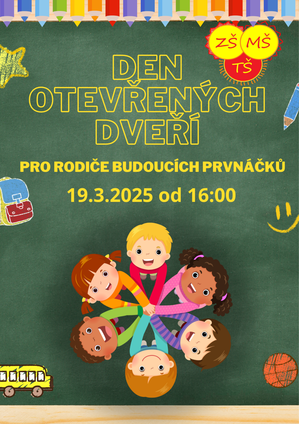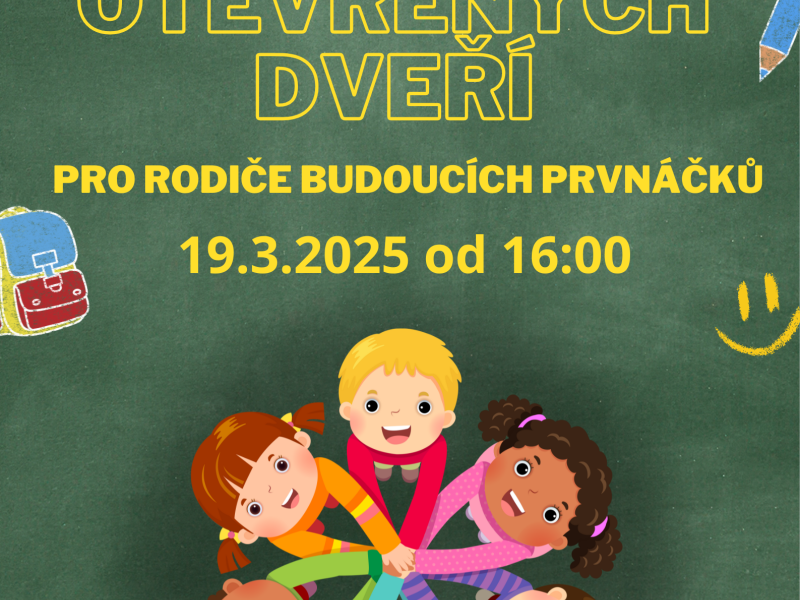 Srdečně zveme všechny rodiče budoucích prvňáčků na den otevřených dveří, kde se dozvíte vše potřebné o nástupu vašich dětí do školy. Těšíme se na vás!