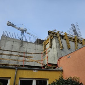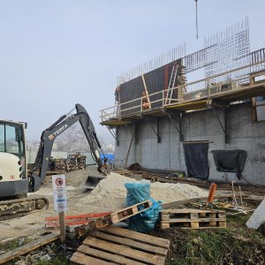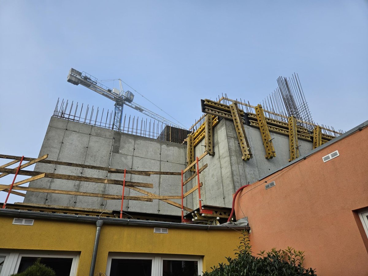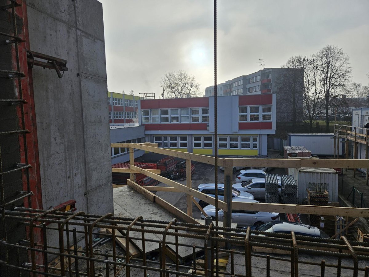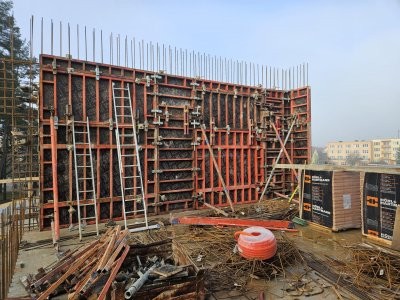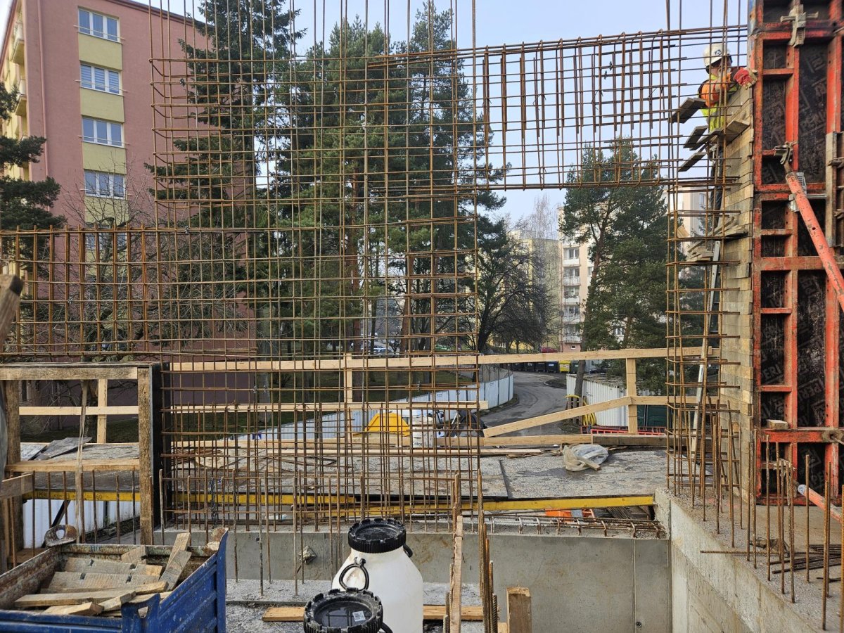 Aktuálně jsme na úrovni 2 NP, montují se výztuže a bednění stěn, parapetů a stropu 2 NP. V celém objektu probíhá příprava elektro. V 1 NP je již provedena hydroizolace, dokončuje se krycí vrstva mazaniny a bude hrubá podlaha.