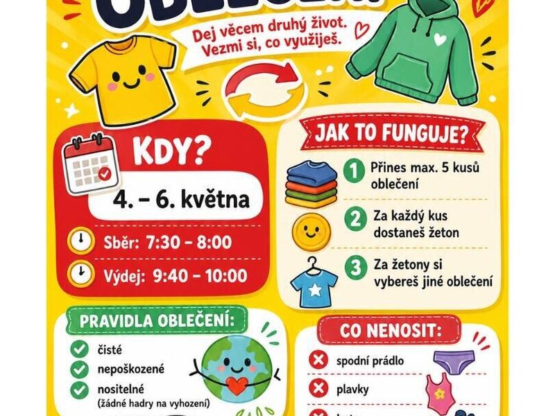 Ve dnech 4.–6. května pořádáme na naší škole Výměnu oblečení, jejímž cílem je vést žáky k udržitelnému přístupu, omezit plýtvání a chovat se ohleduplně k naší planetě