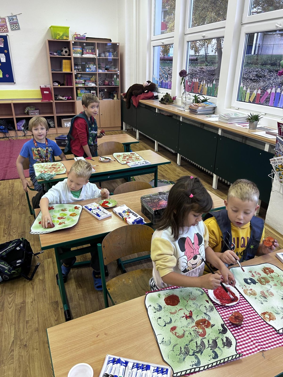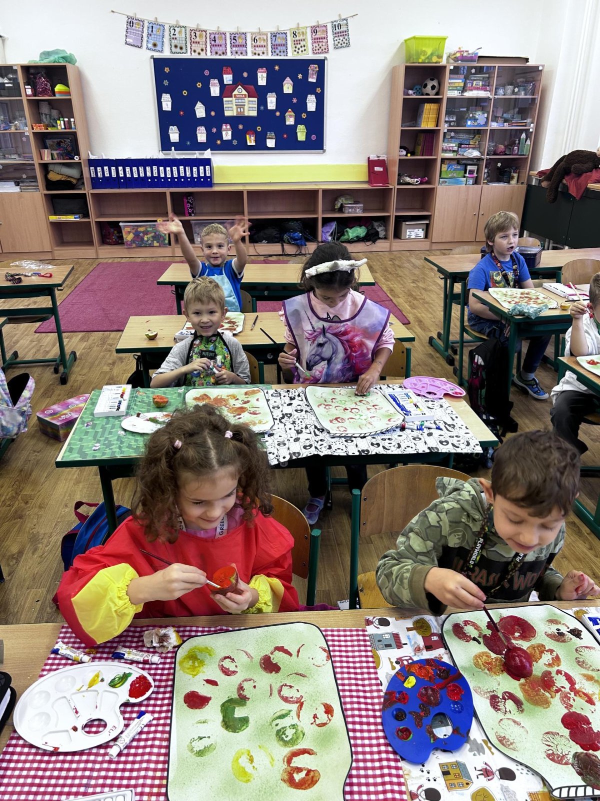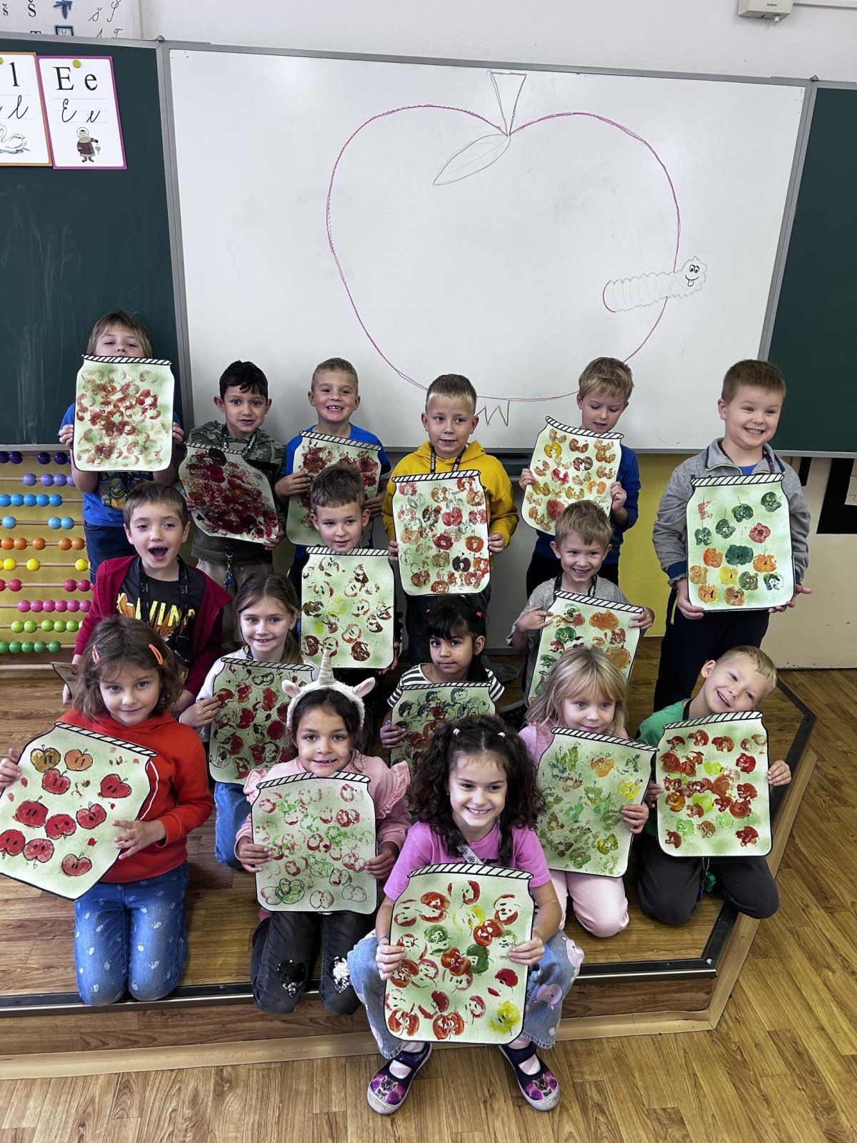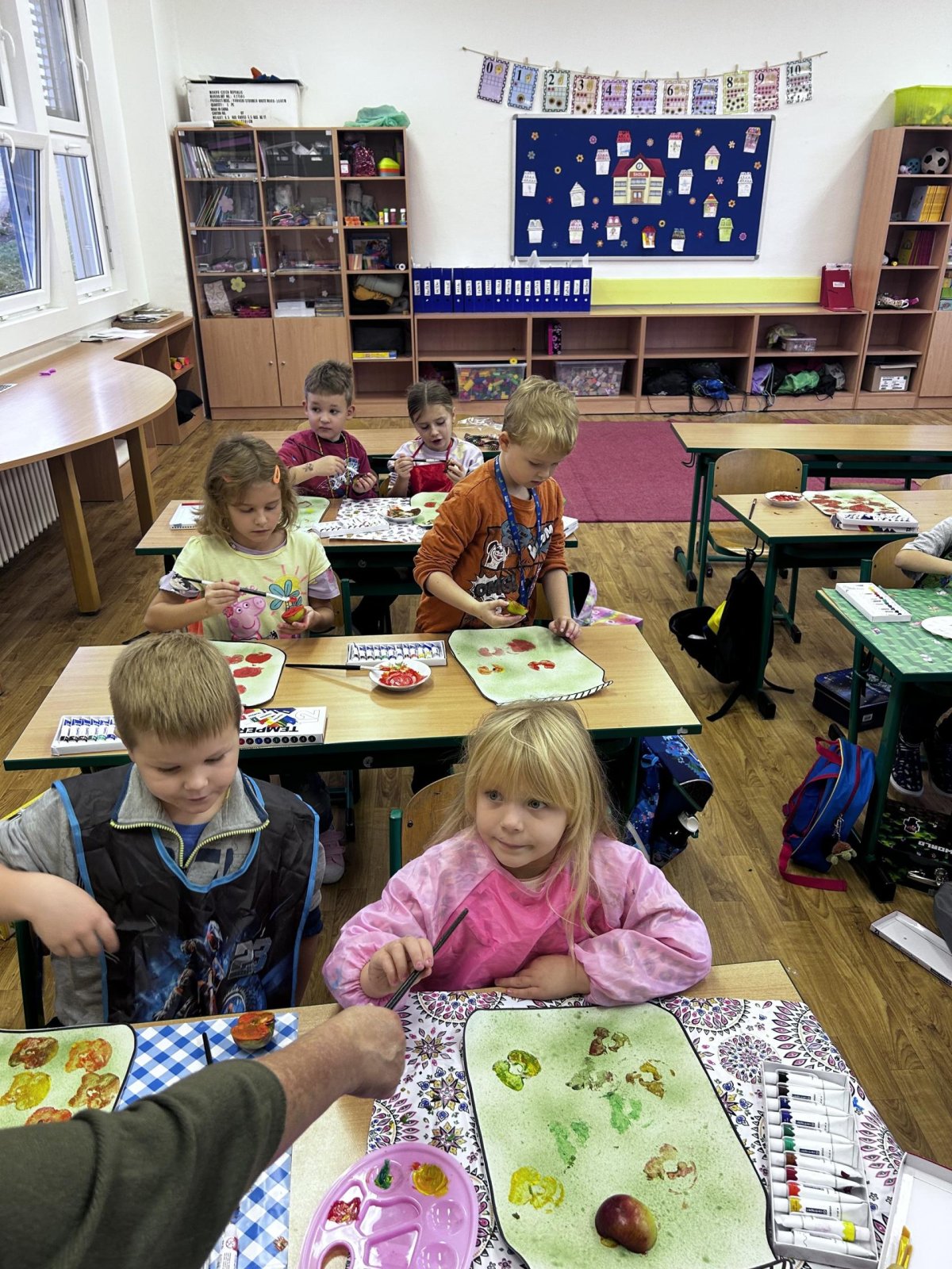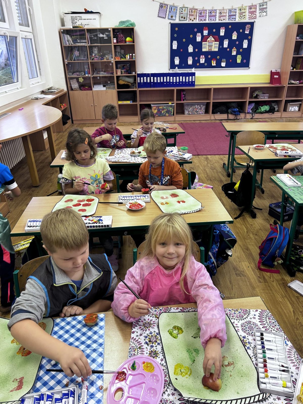 Dne 16.10. jsme si udělali tematický ? den. Jablíčka jsme obtiskovali, počítali, malovali, jedli a nakonec i pili. Akce se nám povedla, a tak nakonec byla sladká jablečná odměna ?